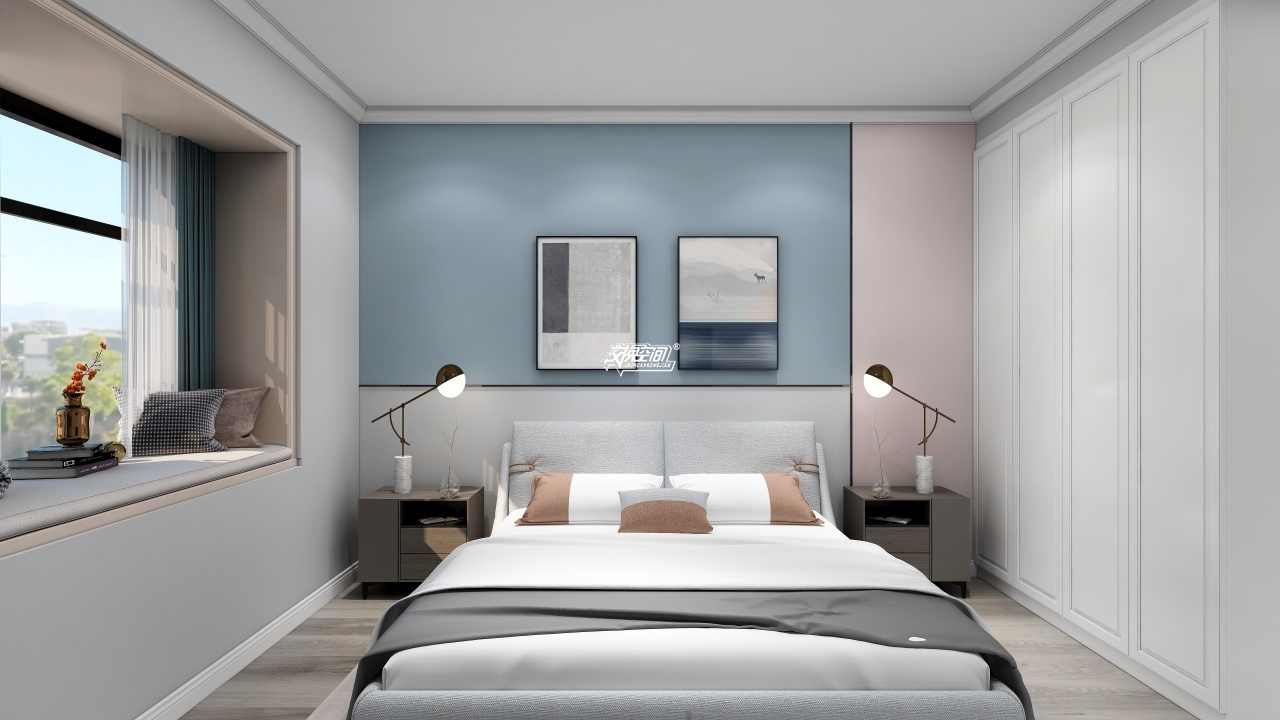 結(jié)束一天的假日旅途,回到臥室后,打開旋螺紋的吊燈與臺燈,撞色與金屬的生命力被喚醒著,空間的整體延續(xù)性在這里完成歸一。