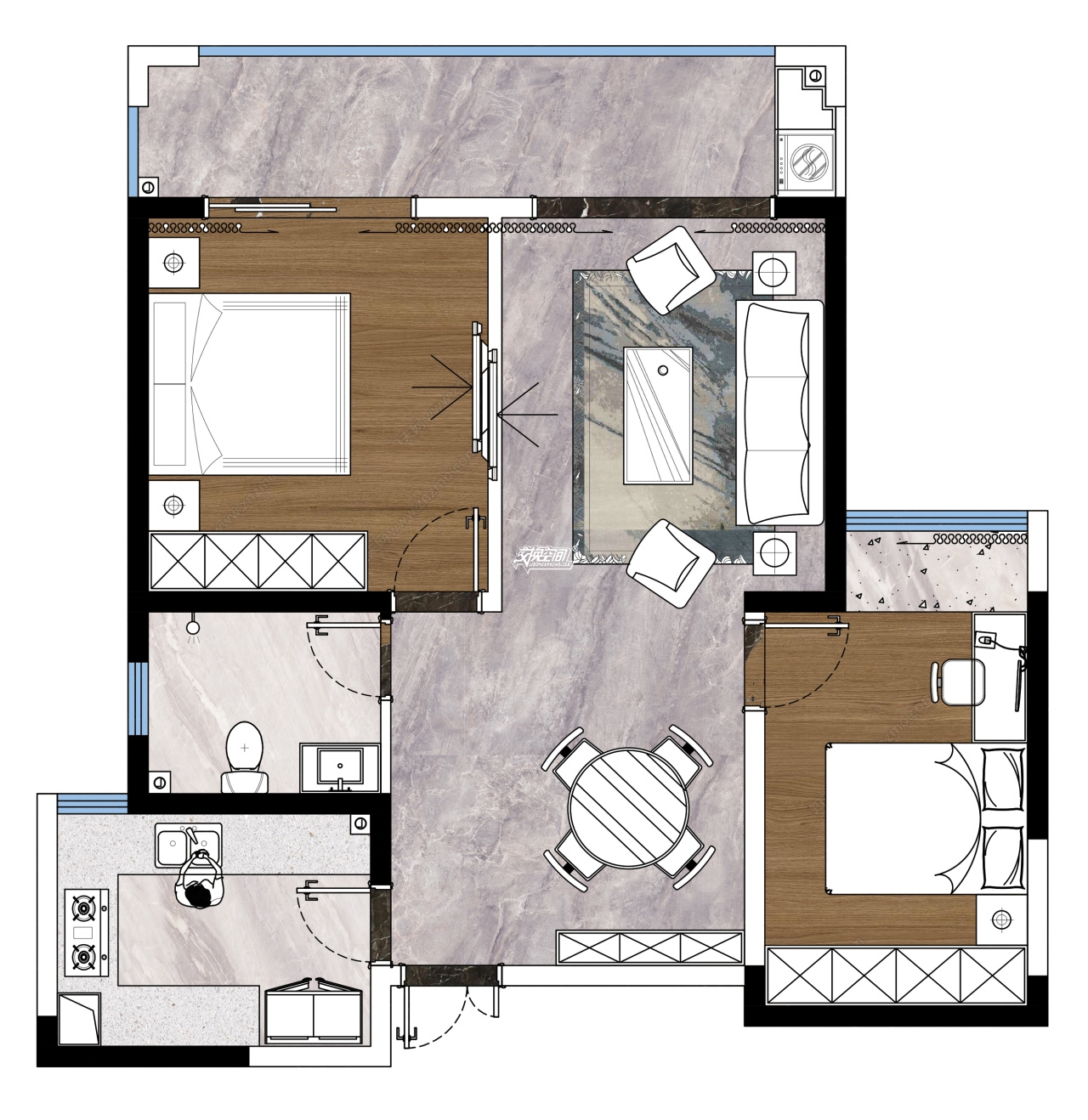 根據(jù)客戶對家的定義和需求,本案選用現(xiàn)代極簡灰為主調(diào),體現(xiàn)都市青年在經(jīng)歷喧囂繁華后,回歸理性主義的生活態(tài)度,同時融入年輕時尚的潮流元素。